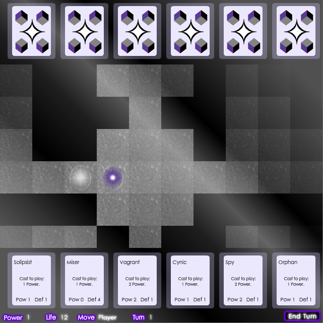 This is a little bit of an unusual game: part cave exploration game, part puzzle game, and part collectible card game. There’s also a rather involved storyline with it. Or as involved as I could get in there with only 48 hours of development from start to finish, anyway: I did the music, sound effects, graphics, coding, etc. all by myself from scratch, so as you can imagine, this has been kind of a frenzied weekend.
